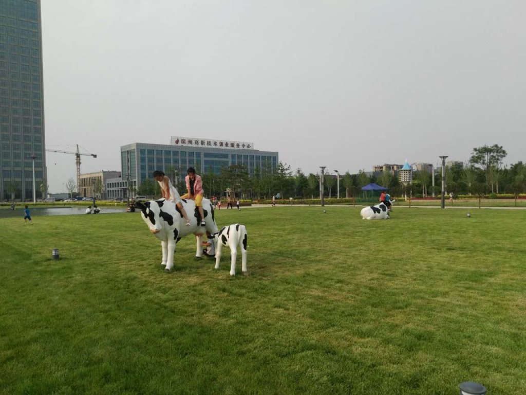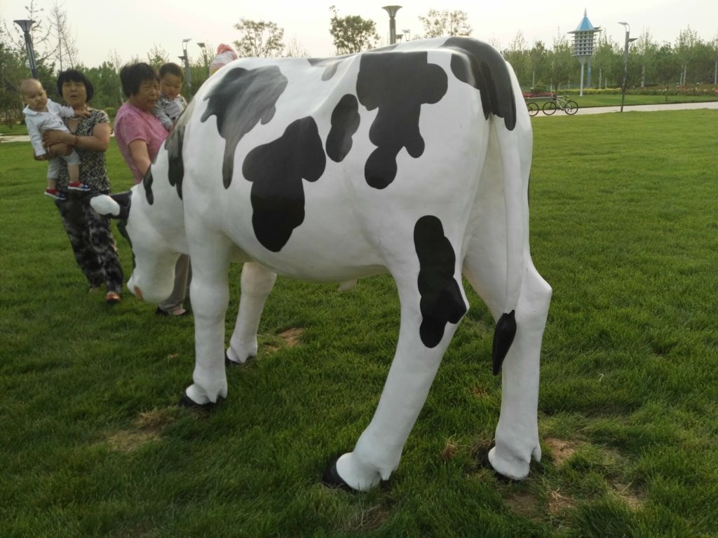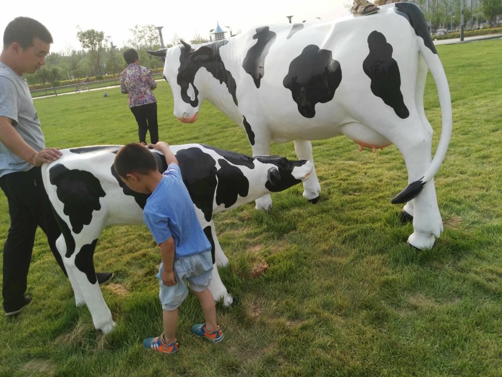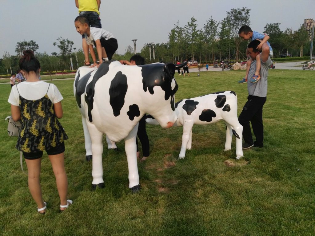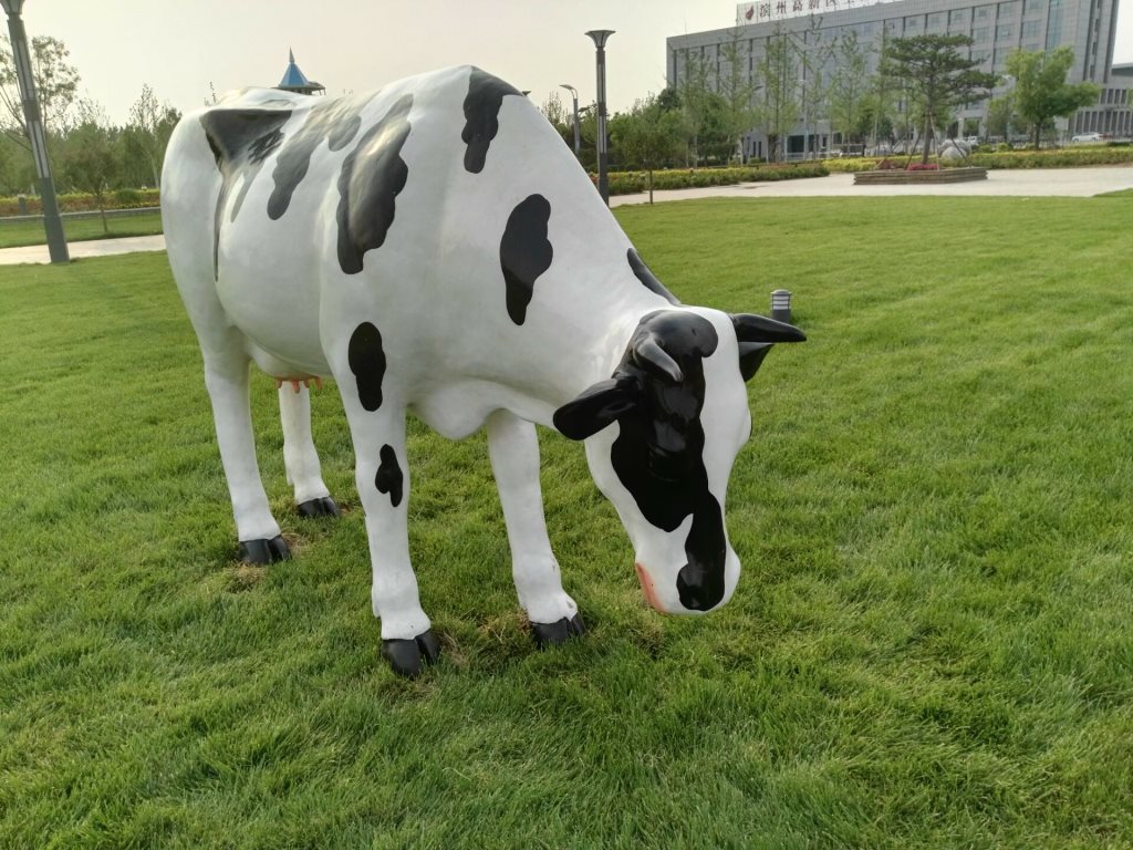 雕塑說(shuō)明:奶牛雕塑共5個(gè),全部玻璃鋼材質(zhì)。本雕塑由我公司自主設(shè)計(jì),五個(gè)奶牛雕塑形態(tài)各異,相互照應(yīng),可以說(shuō)成是一組奶牛群雕。雕塑全部采用寫(xiě)實(shí)風(fēng)格,表面手工彩繪,形象逼真、造型準(zhǔn)確,神態(tài)寧?kù)o、祥和、自如。安裝于山東省濱州市高新區(qū)政府前廣場(chǎng)。