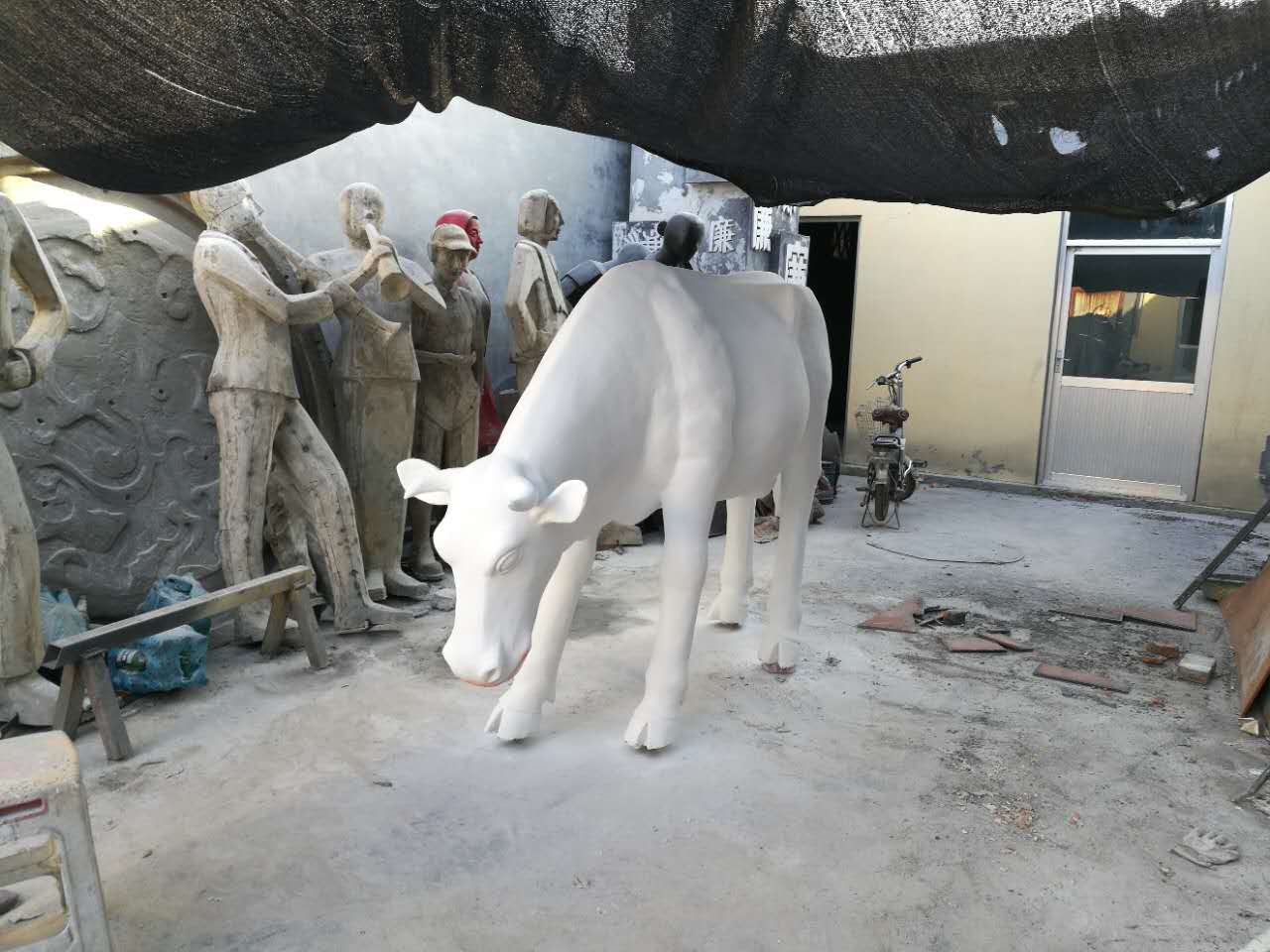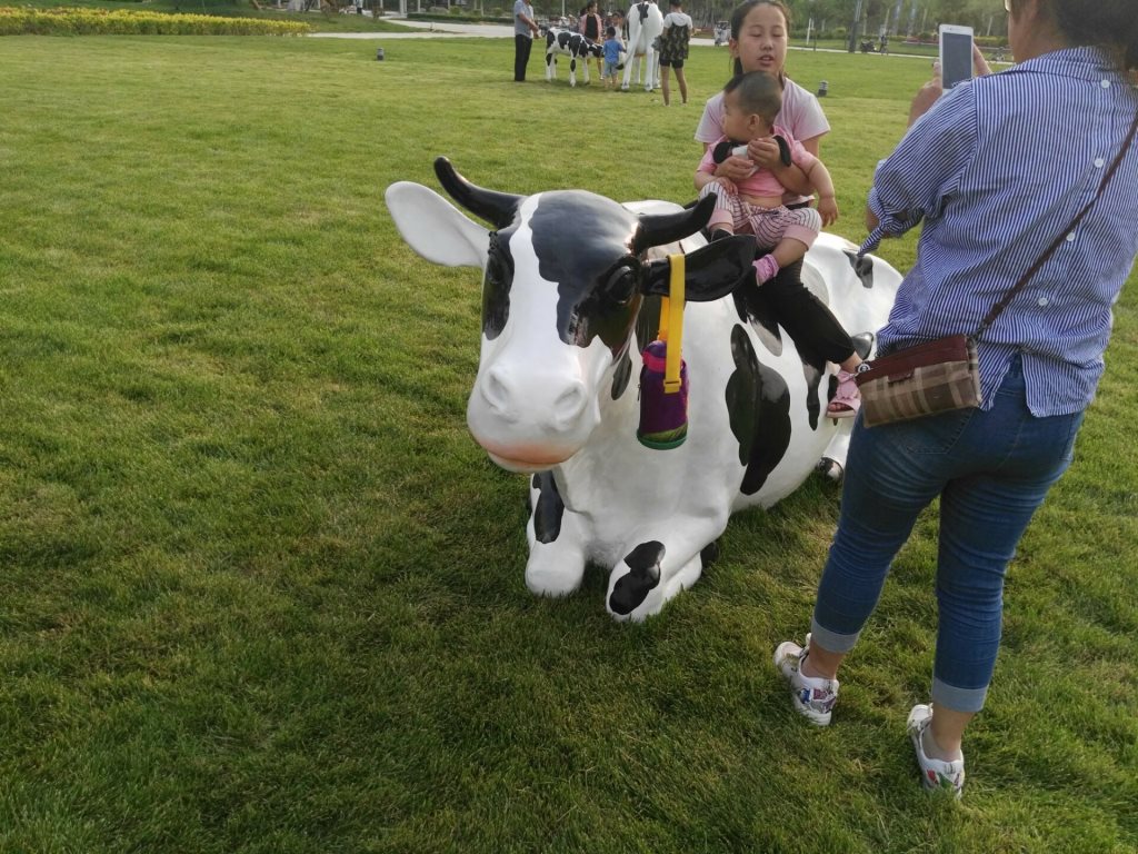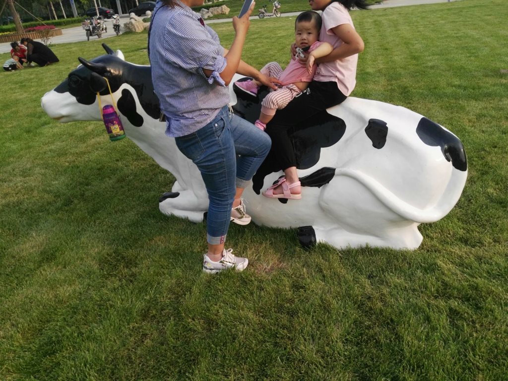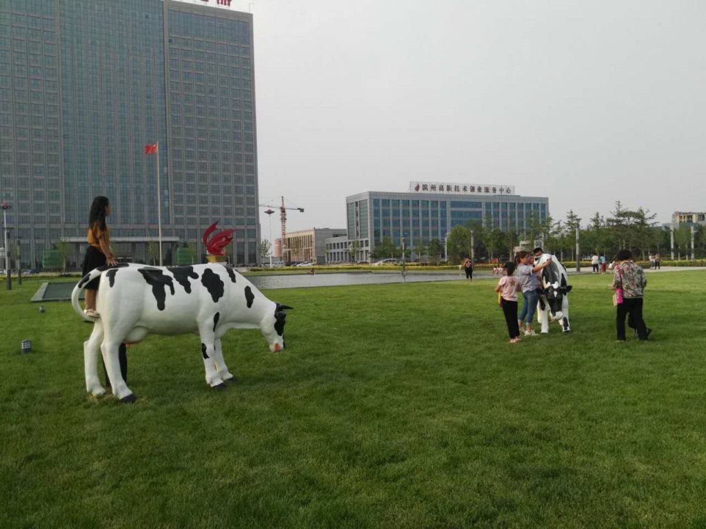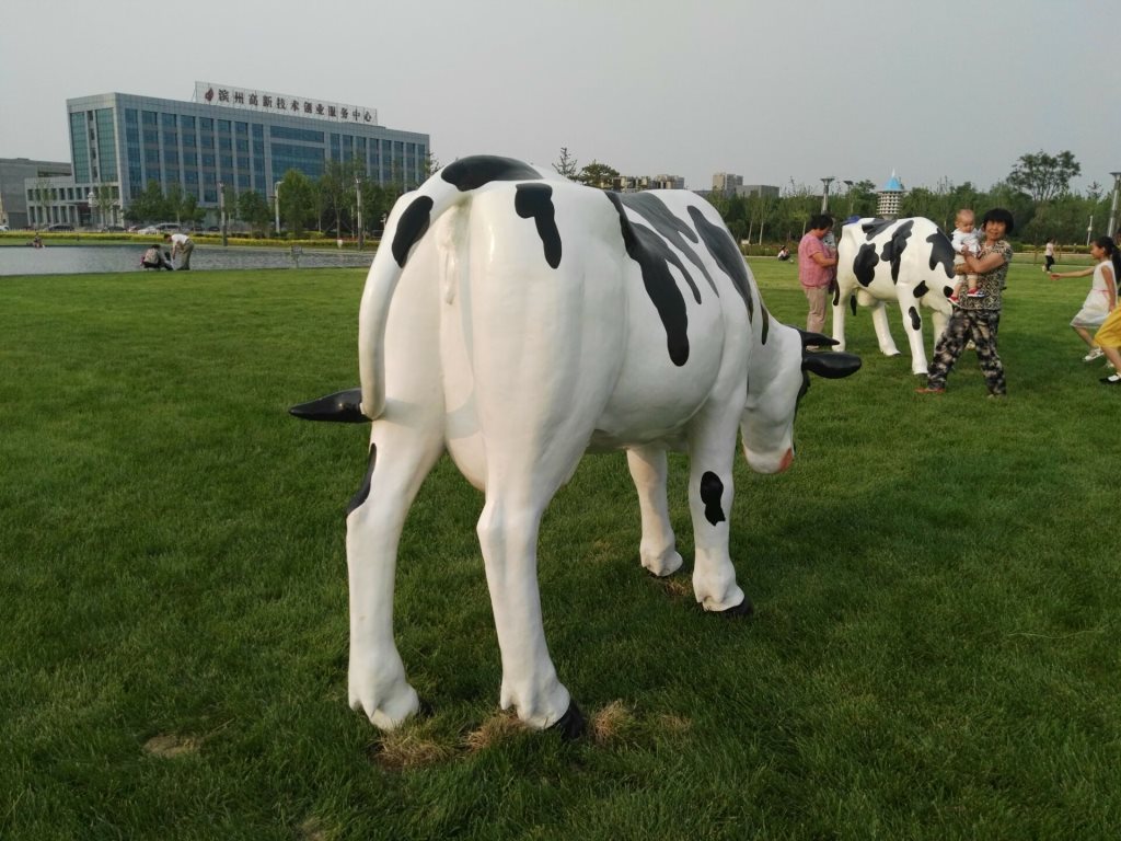 雕塑說(shuō)明:奶牛雕塑共5個(gè),全部玻璃鋼材質(zhì)。本雕塑由我公司自主設(shè)計(jì),五個(gè)奶牛雕塑形態(tài)各異,相互照應(yīng),可以說(shuō)成是一組奶牛群雕。雕塑全部采用寫(xiě)實(shí)風(fēng)格,表面手工彩繪,形象逼真、造型準(zhǔn)確,神態(tài)寧?kù)o、祥和、自如。安裝于山東省濱州市高新區(qū)政府前廣場(chǎng)。