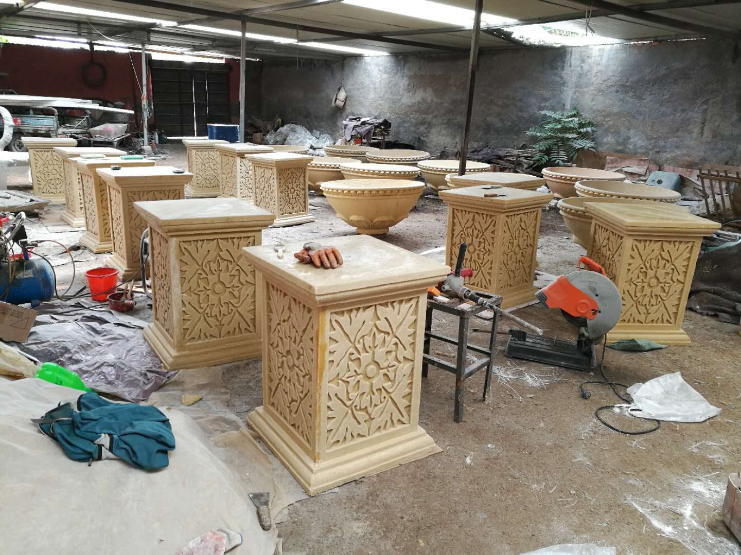 施工內(nèi)容:玻璃鋼牛雕塑、騎車人——不銹鋼雕塑、砂巖花缽雕塑。